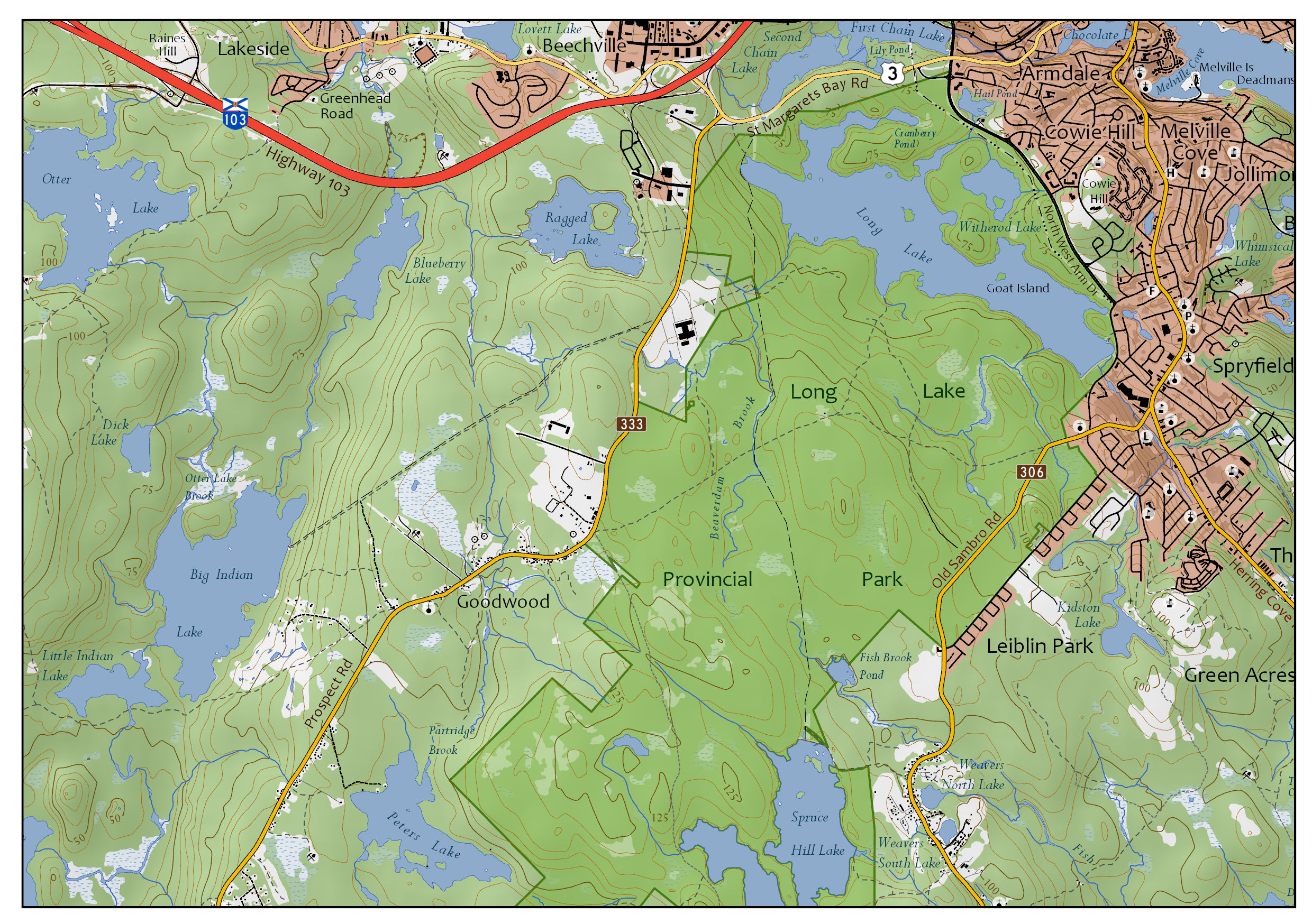 The map shows single buildings with a little black square symbol. Due to the map scale, clusters of buildings in Halifax were very prominent and not useful for the map reader. Those clusters (areas within the boundary of Halifax and a few suburbs nearby) were replaced with polygons representing built-up areas which were generated using the geoprocessing tool Delineate Built-Up Areas. In order to reduce noisiness and reduce white areas between built-up areas and land cover, the built-up areas were aligned along the boundaries of the forested area. In addition, to remove further noises, the forested areas within the built-up areas were put to the background.
