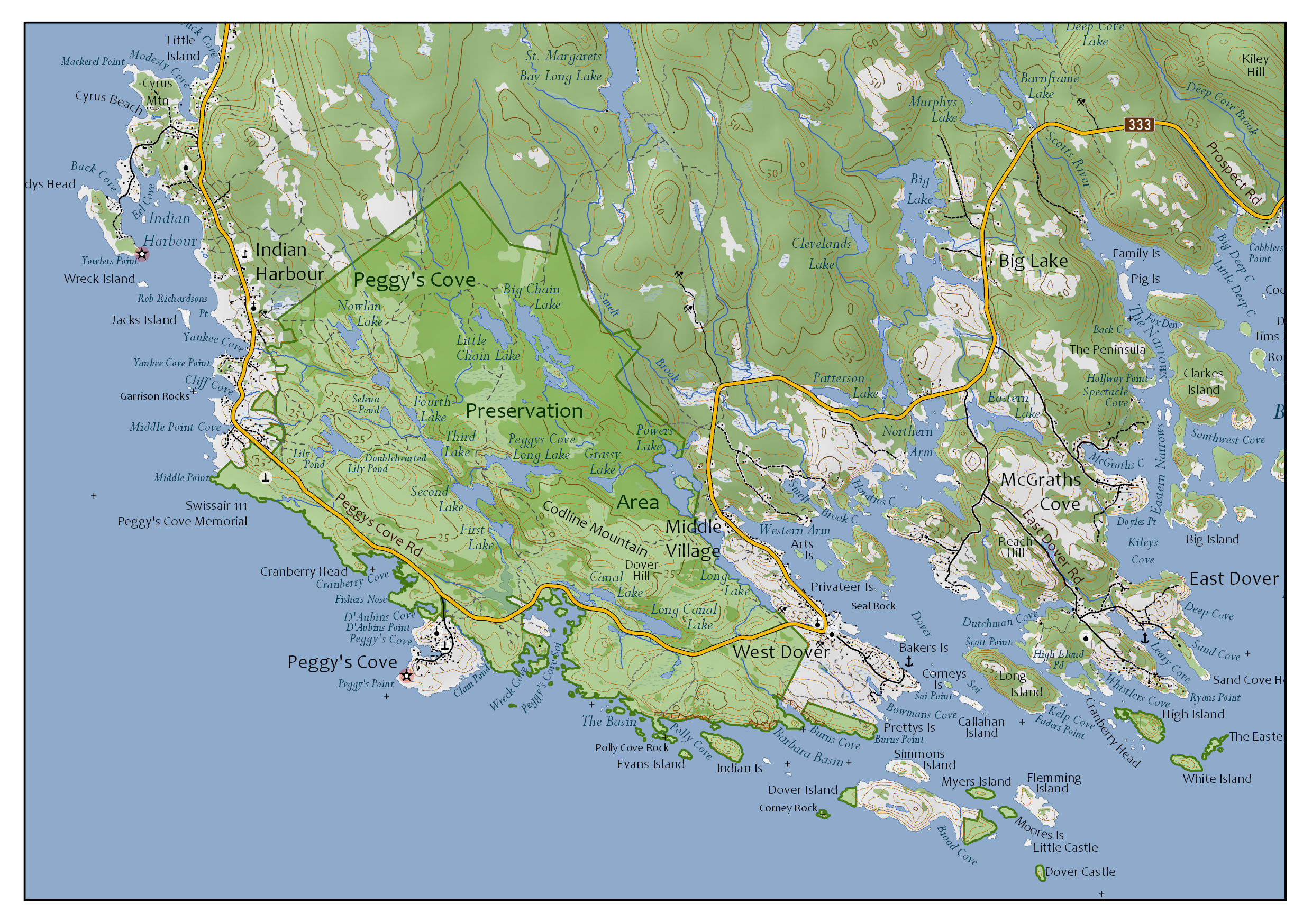 There were very little requirements to create this topographic map. Only the paper format and to use a hillshade was explicitly instructed. Every student in the class was assigned to a study area within Nova Scotia. I was lucky to get Peggy's Cove and surrounding area. At least, that's what I thought at first until I started to label the coves and islands along the coast. ;)
